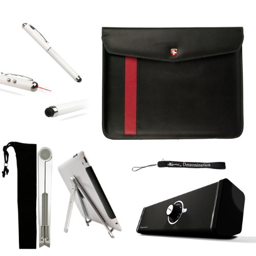 Protect your device with our Premium Leather Portfolio Swiss Sleeve. This sleeve was designed to protect your device from bumps, dents, and scratches. The interior lining is made out of soft neoprene material that will protect your device from scratches. Exterior Material is made out of Faux Genuine Leather with padded cushion to help absorb minor impacts. The compact design doesn't only protect your device but it also maintains that slim feel and that professional look for your business. Case can also fit in any other backpacks briefcase or bags. If you own a silicon skin for a snap on case for your device, this case is also compatible to fit with you device's accessory. Case was designed as an envelope with velcro flap to maintain closed. This unique case is a limited edition, place your order while you still can! // Stream music for your Phone, Tablet, PC, or any bluetooth enabled device wirelessly with the Supertooth Disco Bluetooth Multimedia Speaker. Includes Auxilary Cable // Includes a Pocket 2 Way Adjustable Tablet Stand fits anywhere and feels Strong and Sturdy // Includes a Professor Pen 3 in 1 Red Laser Pointer / LED White Light / Stylus / White Pen // Includes an eBigValue (TM) Determination Hand Strap Keychain for your Keys