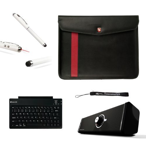 Protect your device with our Premium Leather Portfolio Swiss Sleeve. This sleeve was designed to protect your device from bumps, dents, and scratches. The interior lining is made out of soft neoprene material that will protect your device from scratches. Exterior Material is made out of Faux Genuine Leather with padded cushion to help absorb minor impacts. The compact design doesn't only protect your device but it also maintains that slim feel and that professional look for your business. Case can also fit in any other backpacks briefcase or bags. If you own a silicon skin for a snap on case for your device, this case is also compatible to fit with you device's accessory. Case was designed as an envelope with velcro flap to maintain closed. This unique case is a limited edition, place your order while you still can! // Includes a Slim Travel Wireless Bluetooth Keyboard // Stream music for your Phone, Tablet, PC, or any bluetooth enabled device wirelessly with the Supertooth Disco Bluetooth Multimedia Speaker. Includes Auxilary Cable // Includes a Professor Pen 3 in 1 Red Laser Pointer / LED White Light / Stylus / White Pen // Includes an eBigValue (TM) Determination Hand Strap Keychain for your Keys